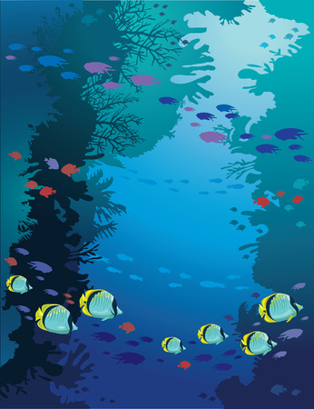 3 つの黄色のチョウチョウウオと青い海の背景にサンゴ礁 水中の海洋生物のシースケープ ベクトル イラスト のイラスト素材 ベクタ Image